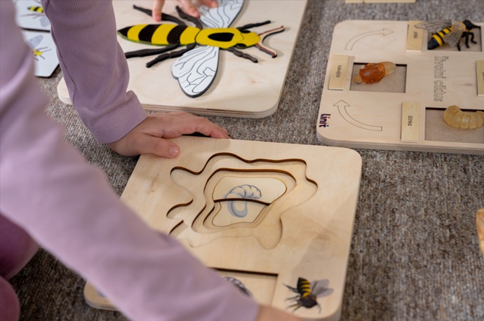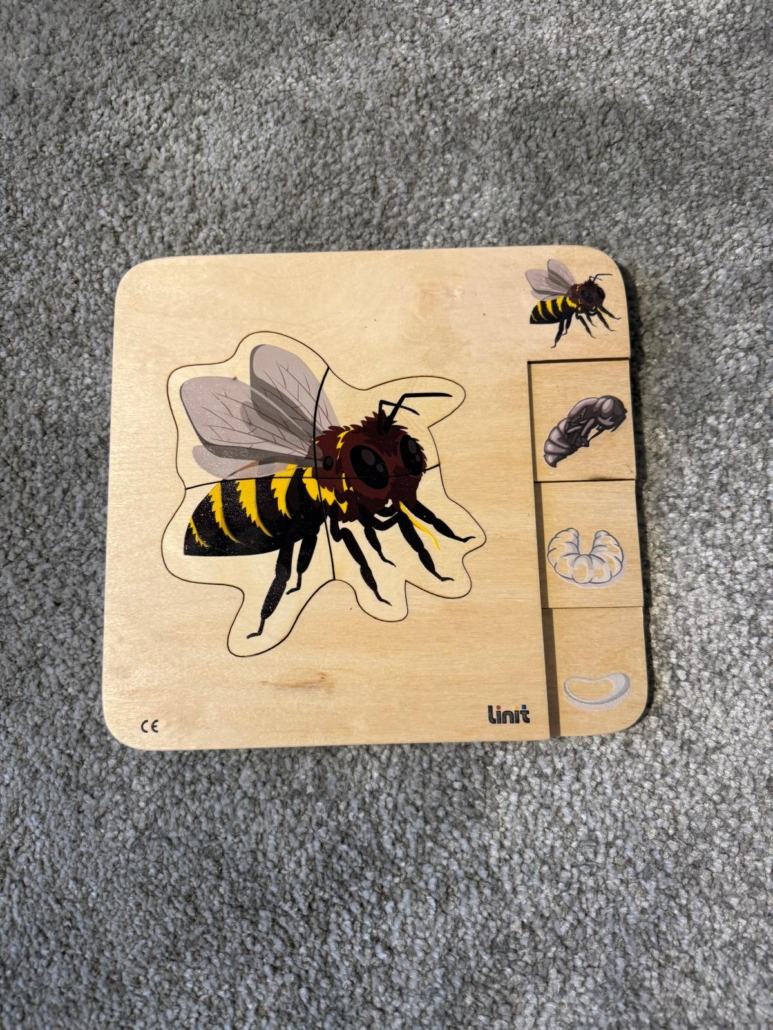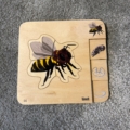 Kroz ovu drvenu slagalicu na zabavan način učite životni ciklus pčele. Ima ukupno četiri sloja i prikazuje četiri promjene kroz koje pčela prolazi prilikom rasta. Prednosti drvene slagalice su da razvija finu motoriku, kognitivne sposobnosti, rješavanje problema i uvodi pojmove životnog ciklusa.