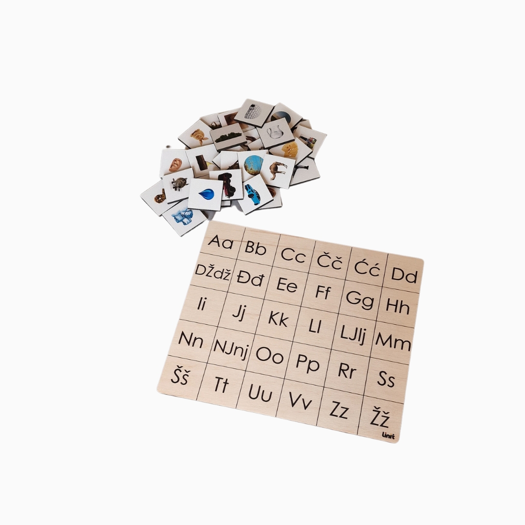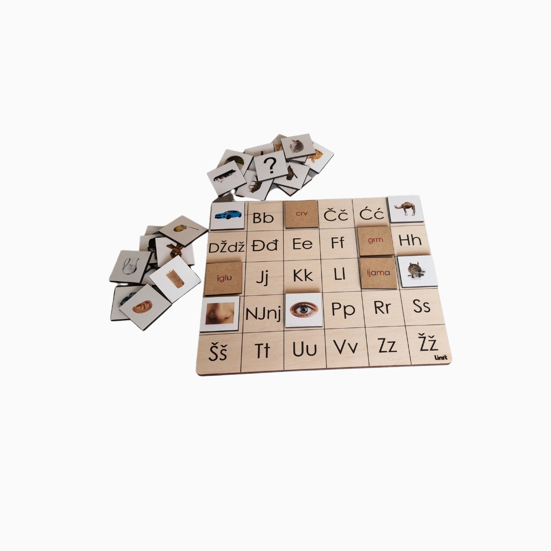 Didaktički materijal uz koji se dijete zabavlja i uči! Proizvod je osmišljen i izrađen prema Montessori načelima. Fotografije su realne, a slova obojana u Montessori boje!