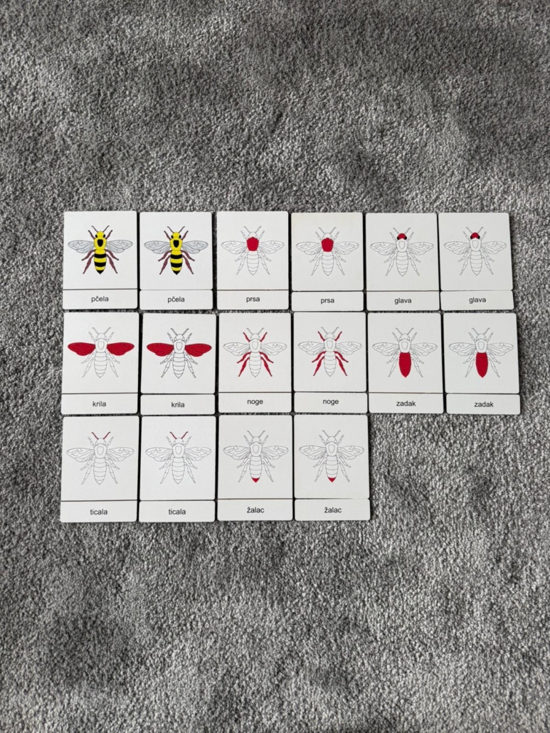 Set se sastoji od 8 pari kartica. Svaki par se sastoji od kartice sa slikom (dimenzije 9,5 x 10,5 cm), manje kartice s natpisom (dimenzije 9,5 x 2,5 cm) i kontrolne kartice (dimenzije 9,5 x 13 cm) na kojoj su slika i natpis zajedno.