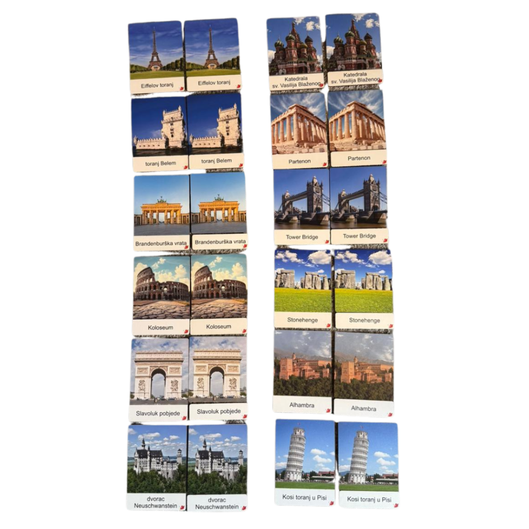 Set kartica izrađen od drva s realnim slikama najpoznatijih građevina u Europi. Set je osmišljen da dijete lakše upozna građevine na području Europe.