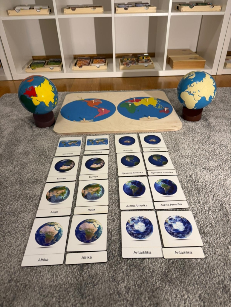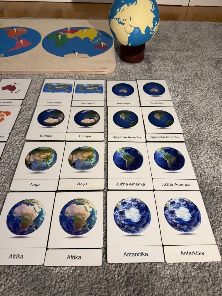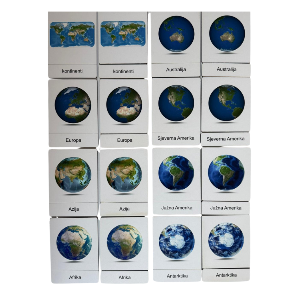 Set kartica izrađen od drva s realnim snimkama kontinenata iz zraka. Set je osmišljen da dijete lakše upozna i razumije kontinente.