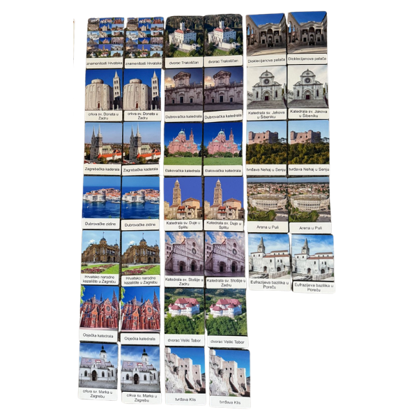 Set od 19 kartica izrađen od drva s realnim fotografijama najvažnijih hrvatskih kulturnih znamenitosti. Set je osmišljen da dijete lakše upozna hrvatske kulturne znamenitosti.