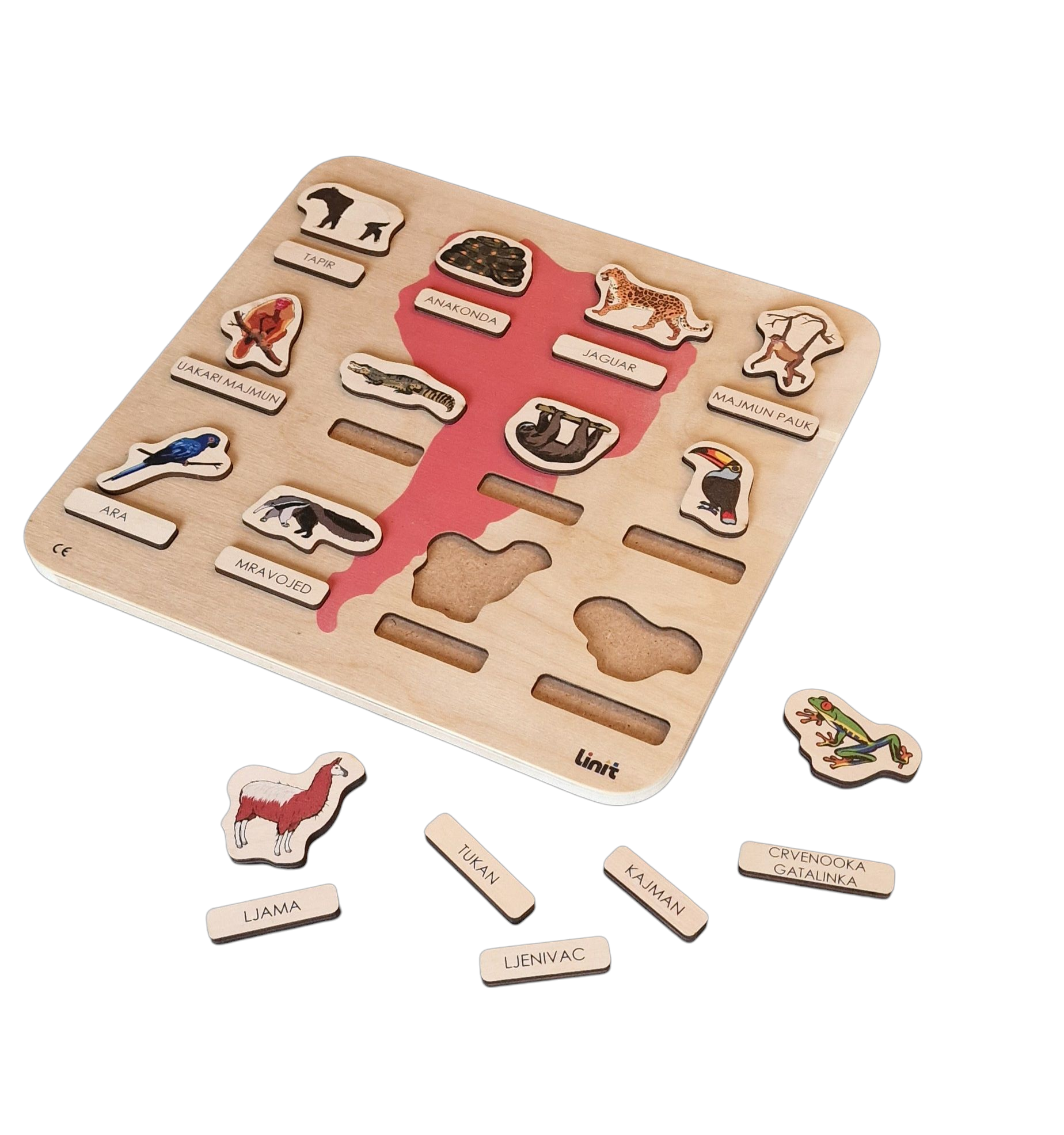 Sadrži: 7 ploča (kontinenti) + drvene kpločice sa slikama i nazivima životinja