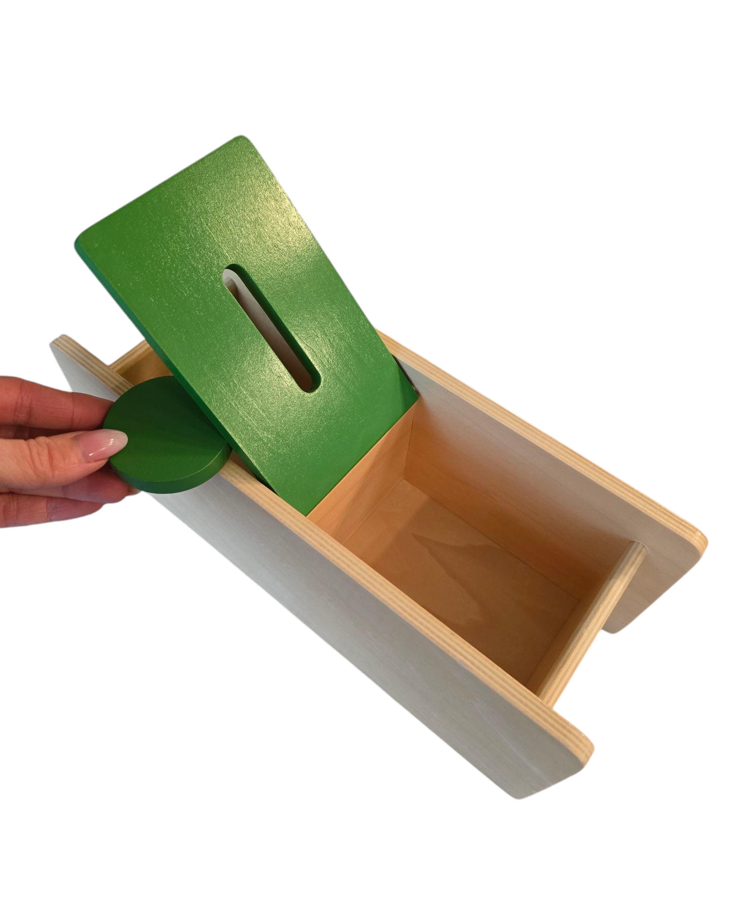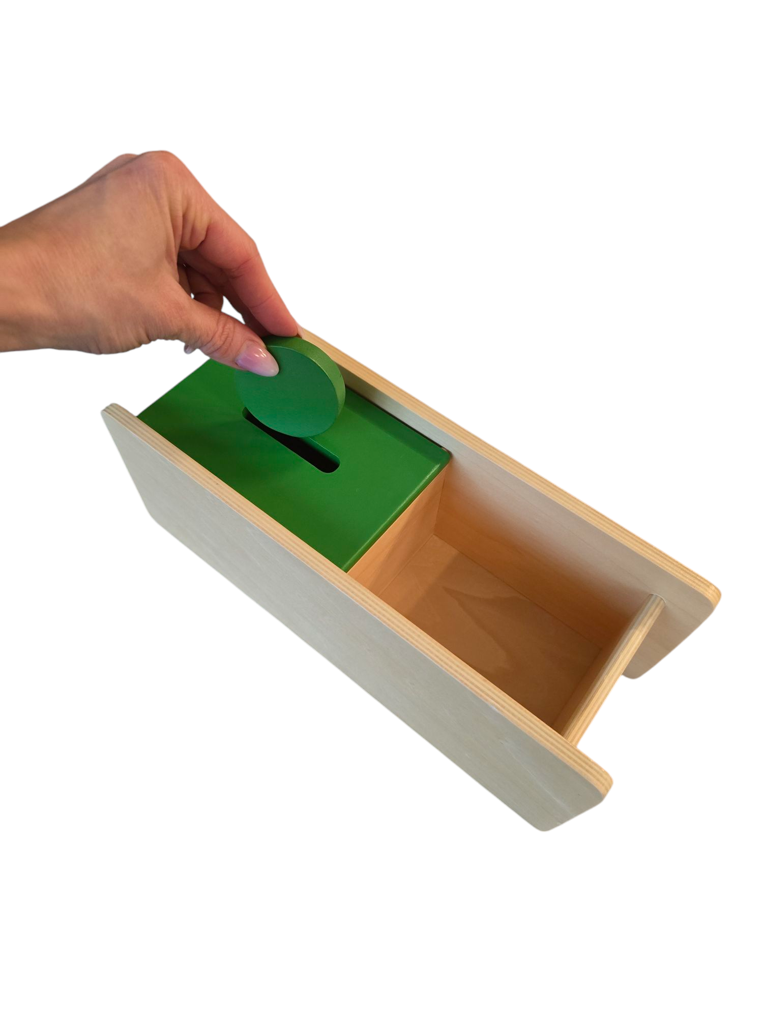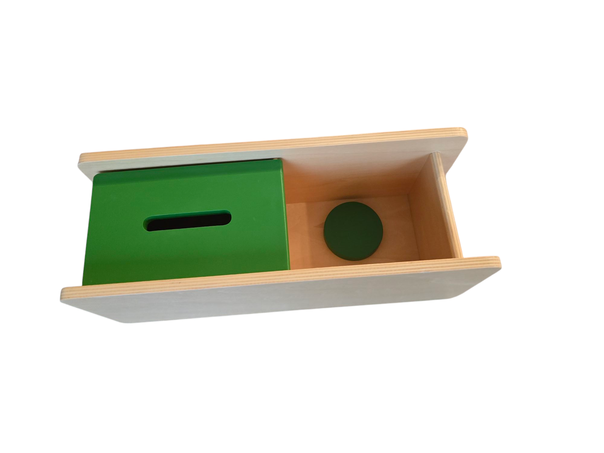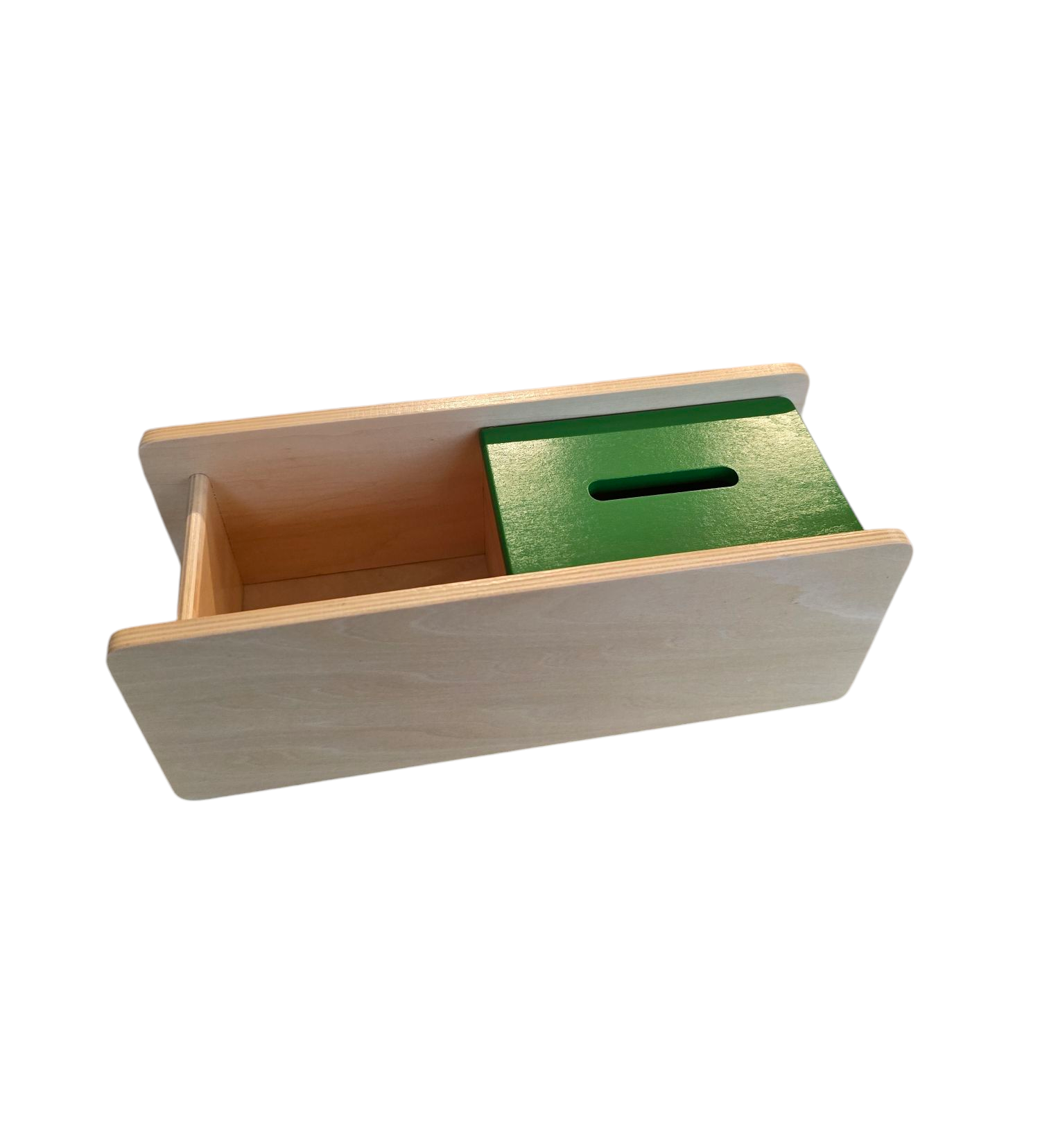 Montessori materijal( Imbucare Flip Box ) koristi se za razvoj koordinacije ruku i očiju, fine motorike i razumijevanja trajnosti objekta kod male djece (najčešće između 6 i 18 mjeseci, ali može biti koristan i starijima).