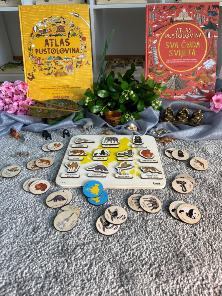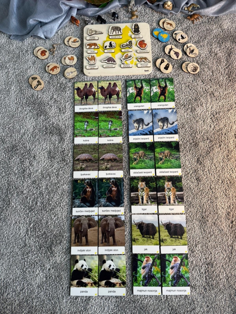 MontiSet Azija životinje se sastoji od Umetaljke životinje Azije, Memory igre životinje Azije i klasifikacijkih kartica Životinje Azije.