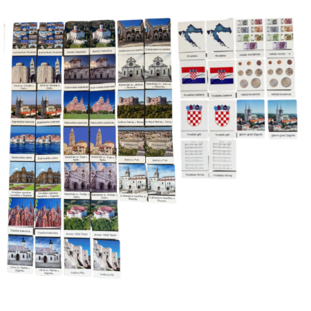 MontiSet Obilježja Hrvatske sadrži dva seta klasifikacijskih kartica: Kulturne znamenitosti i Obilježja Hrvatske. Uz ove setove izrađene od drva dijete uči o glavnim hrvatskim obilježjima i kulturnim znamenitostima na lak i zabavn način.