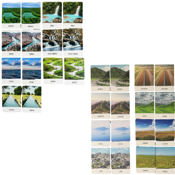MontiSet Reljefna obilježja Hrvatske sadrži dva seta klasifikacijskih kartica reljefnih i vodenih površina na području Hrvatske. Rok isporuke 2-14 dana.
