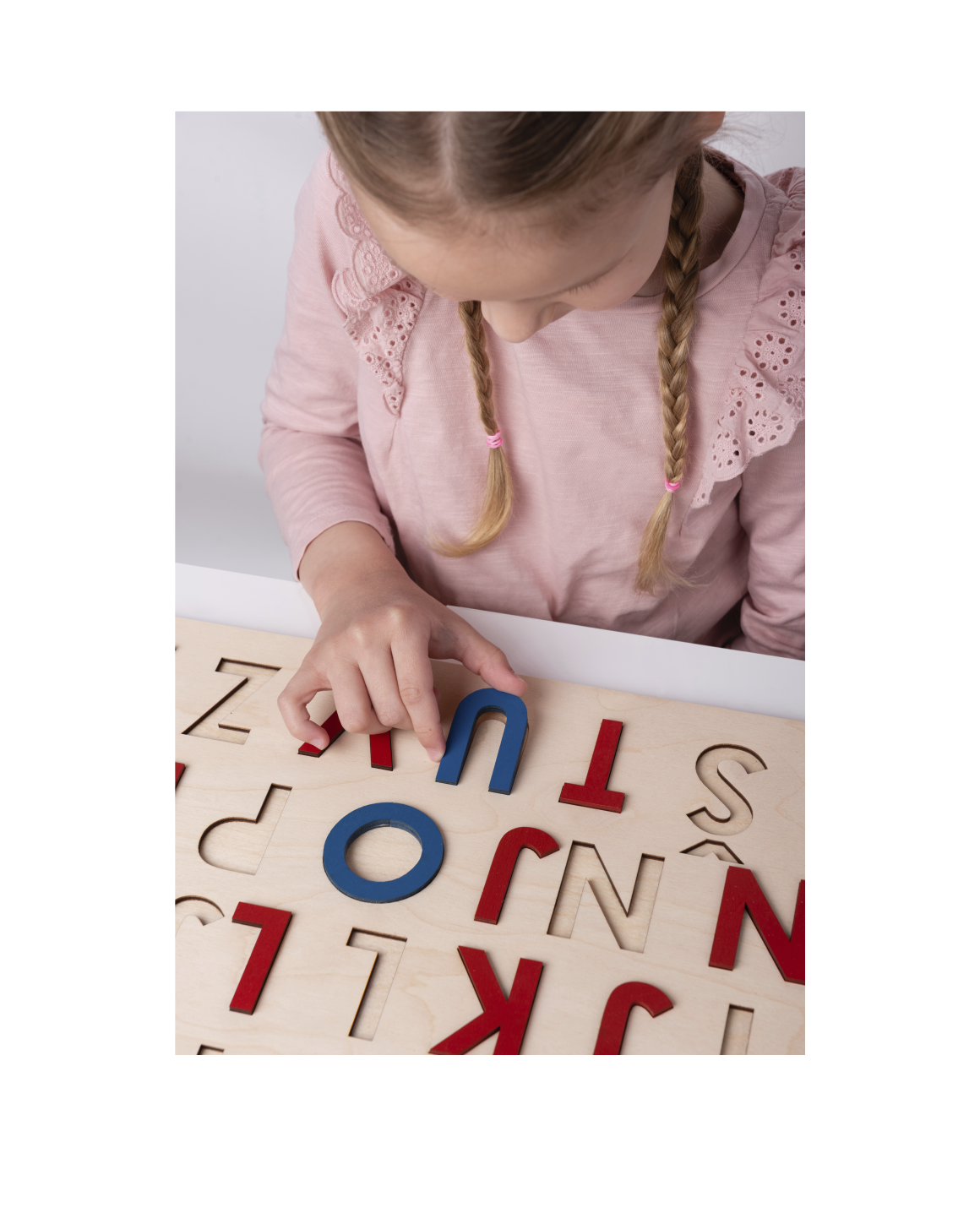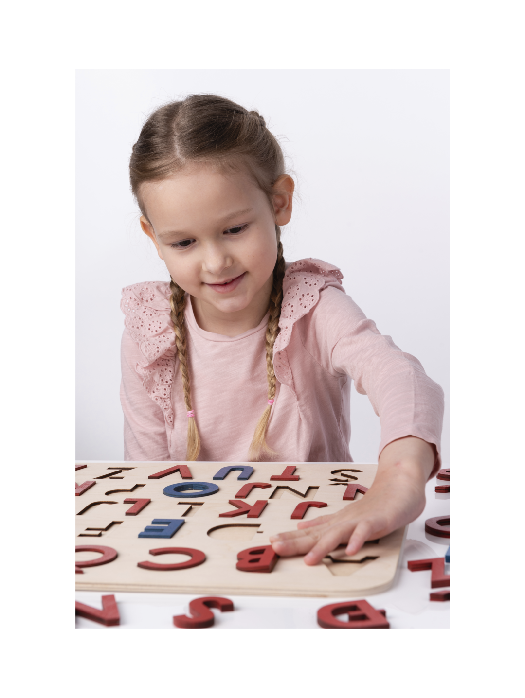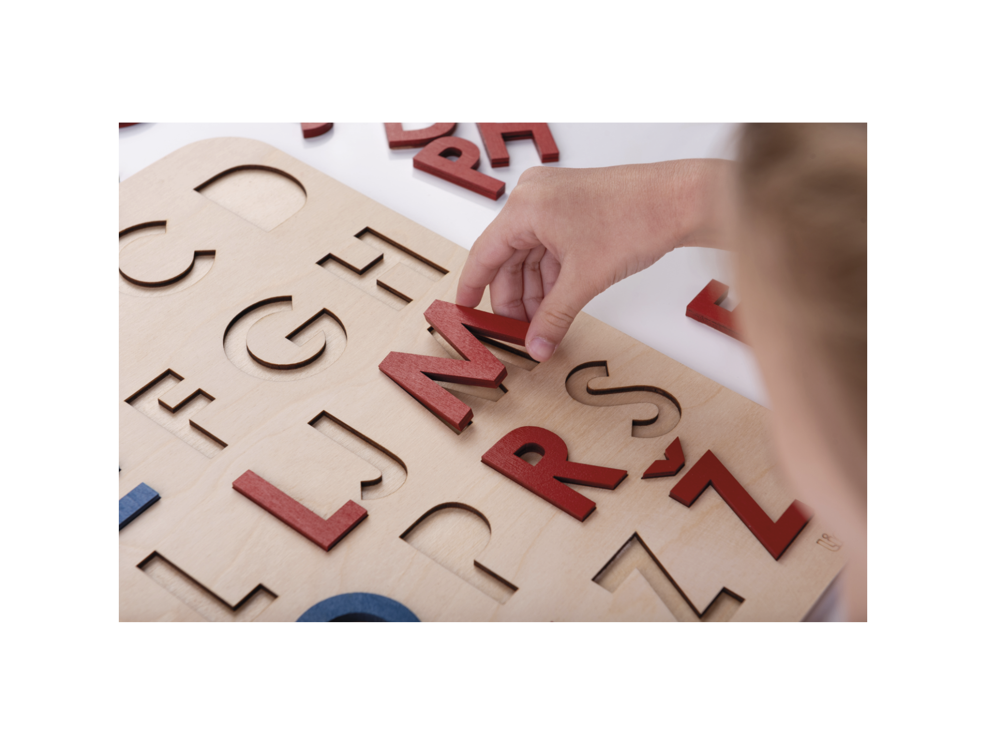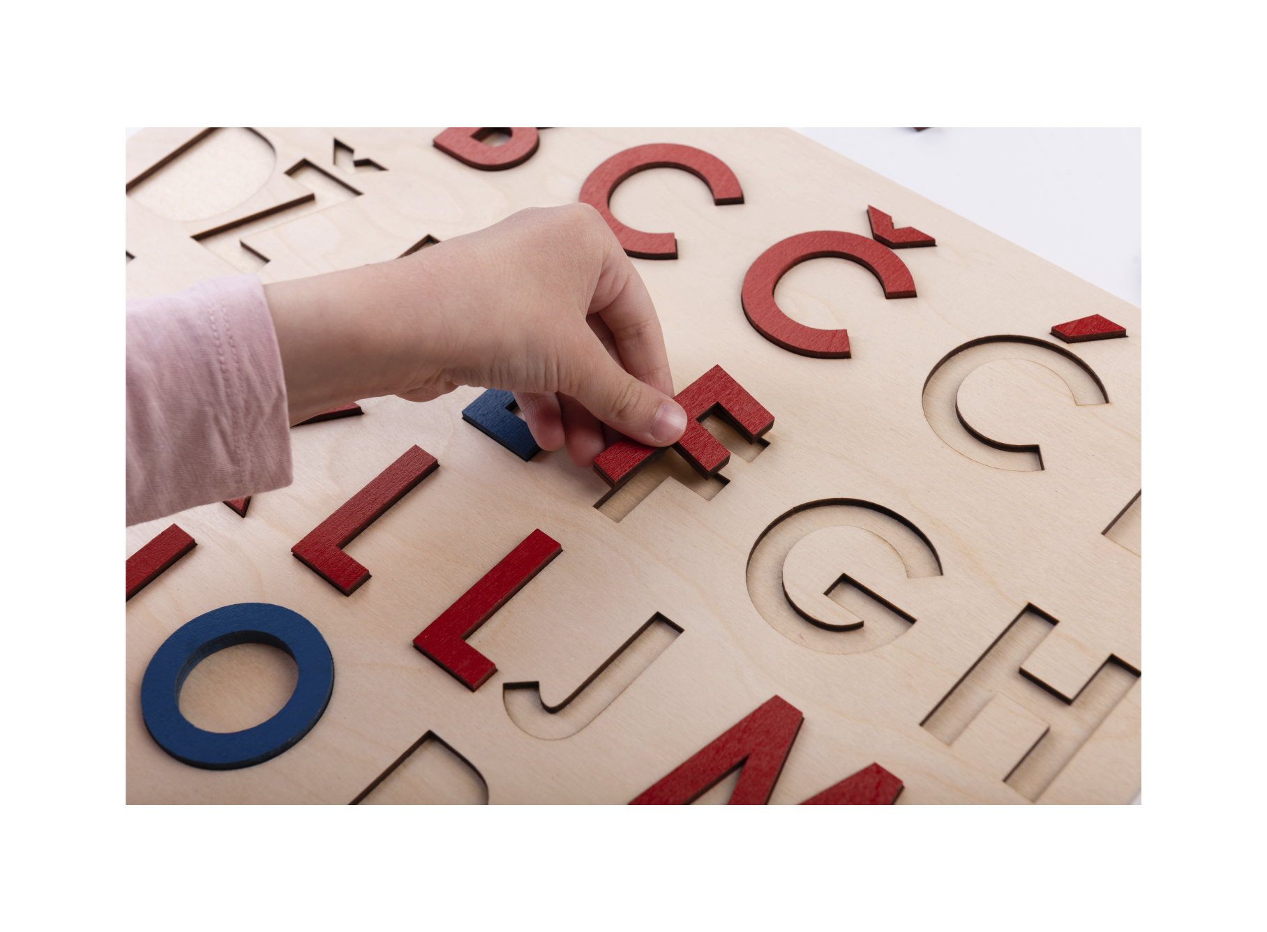 Velika tiskana slova su prva slova koje dijete raspoznaje u procesu opismenjavanja. Ova umetaljka ima cijelu hrvatsku abecedu sa svim pomičnim dijelovima koji omogućavaju djetetu da se osim vizualno i taktilno upozna s oblikom velikih tiskanih slova. Dijete umeće slova u utore istog oblika pamteći pri tome oblik svakog slova te radeći prve poveznice slovo – glas. Kada dijete drži određeno slovo u ruci, zajedno s njim imenujte slovo glasom i pridružite neku riječ (npr. M kao mama, prvo slovo imena djeteta je snažna poveznica i najčešće je prvo slovo koje dijete nauči – I kao Iva).
